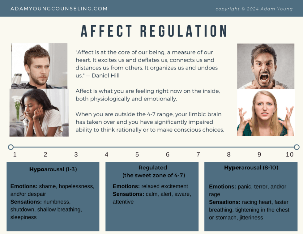 I like to think of the window along a scale. Adam Young, host of The Place We Find Ourselves podcast, offers this visual aid below as a reference. He calls it “affect” regulation. He and Dr. Siegel are referencing the same thing: the nervous system response to stimuli.